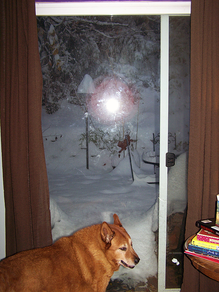 The poor dog boinged out the door to take his morning constitutional and sank into snow up to his shoulders. He stopped dead and looked back at me, standing in the doorway, turned around and slinked back inside.