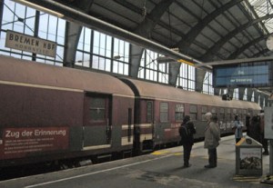 Forty-five minutes later, I had to change trains in the much larger Bremen Bahnhof. There wasn’t much time, so in spite of my difficulty with reading the German train schedules, I found my train and lugging my suitcase, a shoulder bag and my purse, limped as fast as I could to the proper platform and boarded. I found an empty berth and, my suitcase stowed, took a window seat and settled down for the journey. I was excited! I hadn’t done much traveling on my own since we’d arrived in Germany, so this was a real adventure. As the train started rolling and gained speed, the car gently rocking and wheels clacketty-clacking, I felt like a character in an old Helen