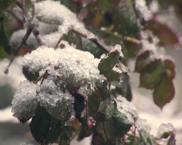 Dusky snow Posted on April 12, 2010 by Wren The forecast was for rain. But now, at dusk, it's 34 degrees outside and yes, it's snowing, slowly building up on my old, vintage climbing rose's new spring leaves. It's strange and beautiful. Share with your friends! Click to email a link to a friend (Opens in new window) Email Tweet Click to print (Opens in new window) Print Click to share on Reddit (Opens in new window) Reddit Share on TumblrLike Loading... Related