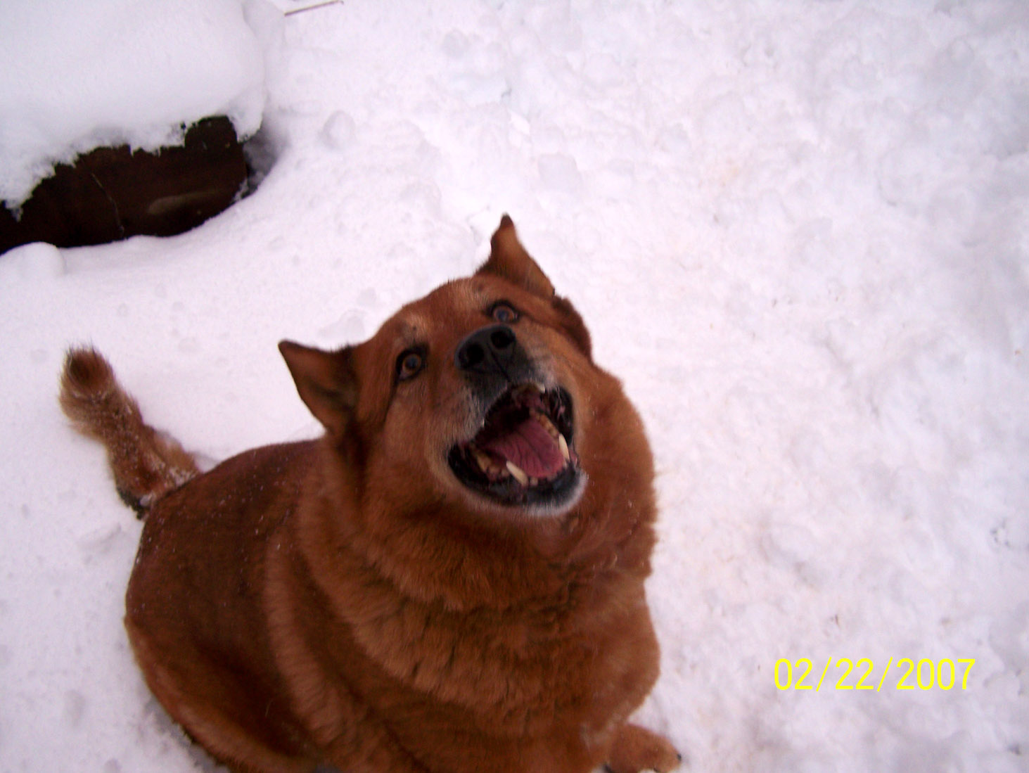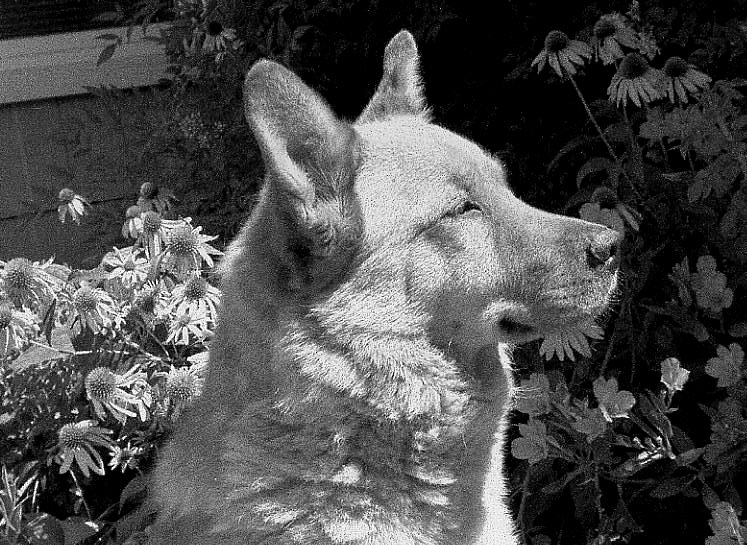 Logan loved to play in the snow, leaping into the air to catch tossed snowballs and chomp them, spraying snow from the sides of his mouth. He’d do it for hours, as long as someone would throw the snowballs for him. He loved to run back and forth along the back-garden fence-line – there’s a worn-to-the-dirt path in the high grass there now that he made all by himself from years and years of determined patrol. For most of his life, he didn’t bark. Instead, he “yodeled,” a sudden, eardrum-piercing, banshee shriek that could raise the hair on the back of your neck. His world was our house and the big back garden. He guarded it all faithfully. I was never afraid to be home alone with Logan around. He’d have made short work of intruders.