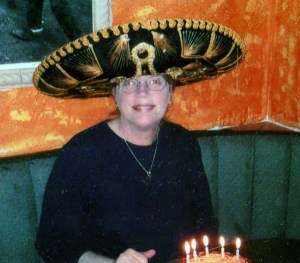 When the plates were cleared,  six handsome Latino waiters arrived at our table bearing a beautiful chocolate cake with candles (one for each decade! Erk, again!). And then, to my surprise and considerable embarrassment, a gigantic sombrero was plopped on my head and they sang Happy Birthday Conchita to me, complete with guitar and maracas. One of them snapped a picture, and as we finished eating the cake, I was presented with a card from the restaurant with my picture inside it.