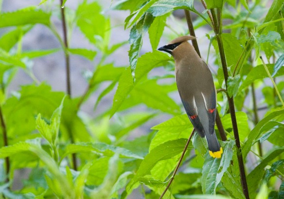 But back to the waxwing. Something about that bird just mesmerized me. I loved the jaunty little crest the male of the species sported like a cocked hat on his head, but more than that I loved the markings and colors both genders were adorned with. Rich, cinnamon brown bodies,dusted with pollen-like yellow on their tummies. Gray silk wings. Black bandit masks over their eyes. Their tail-tips looked as if they’d been dipped in thick, brilliant yellow paint, and there were tiny dabs of vibrant red on their wings, like afterthoughts. Amazing. Beautiful. I imagined God with a tiny paintbrush, putting the final touches on his latest creation.